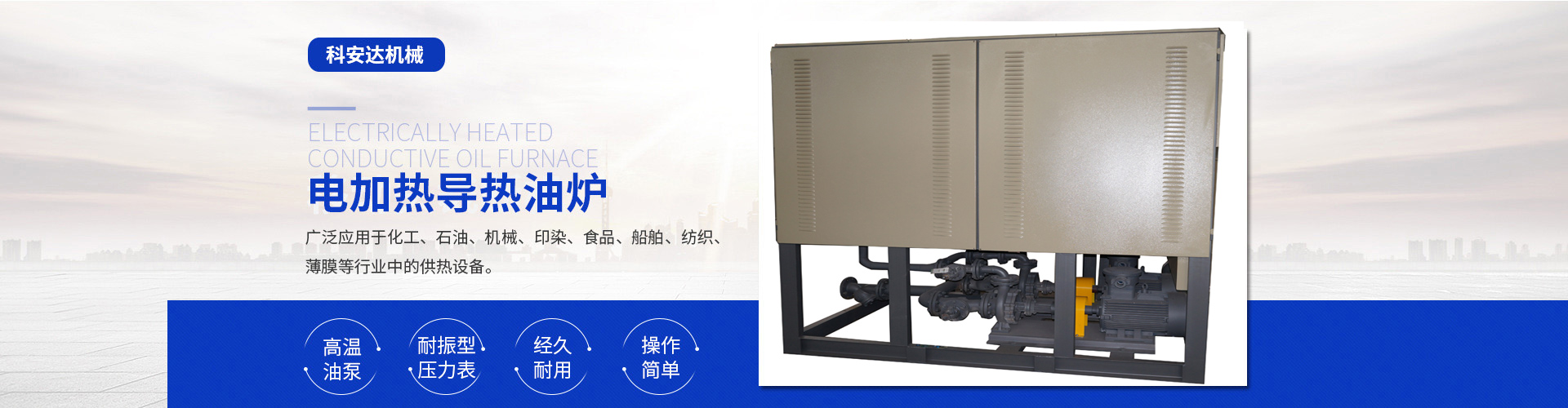 近年來我公司在延用自己的技術基礎上不斷引進先進技術與管理經驗,專業(yè)研發(fā)制造電加熱導熱油爐(有機熱載體爐)、電磁感應加熱器、電加熱爐、熱風循環(huán)箱式預熱爐、風道加熱器、空氣加熱罐、電加熱管、高溫電阻爐、保溫烘箱、烘道、鑄鋁鑄銅加熱器、防爆加熱器、遠紅外加熱管、埋入式遠紅外陶瓷加熱瓦、陶瓷加熱圈、不銹鋼云母電熱圈、碳化硅遠紅外電加熱板、電熱帶 、真空清洗爐、三甘醇清洗爐等。產品適用于化纖、紡織、皮革、塑料機械、電纜機械、食品機械、橡膠機械、冶金、石油、化工、電子、醫(yī)療、海洋工程、家用電器等行業(yè)。同時可根據客戶使用與現場安裝的需要,設計、制造特殊規(guī)格的上述設備,企業(yè)以其先進技術、合理的價格,周道的服務使產品遠銷國內外。